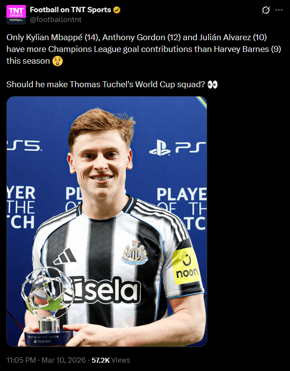 Harvey Barnes scored Newcastle’s only goal against Barcelona. He now has 9 G/A in the Champions League, which is genuinely impressive.